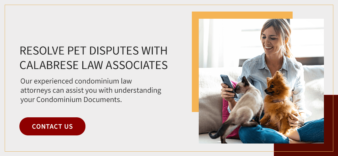 Some of the conflicts involving pets at condos handled by the condo law attorneys at Calabrese Law Associates arise from a misunderstanding of the legal difference between service animals, assistance animals and pets. Our experienced condominium law attorneys in Boston and Burlington, Massachusetts, can assist you with understanding your Condominium Documents. We have seen cases where the condo’s rules don’t address the use of assistance animals, and our team can make sure your agreement is fair, follows the law, and protects tenants and unit owners from liability.